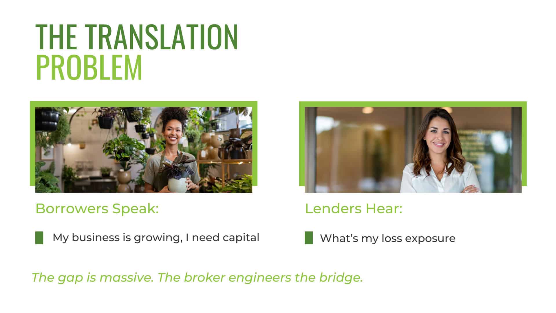 These are completely different conversations happening simultaneously. Without translation, good deals fail. Businesses don’t get funded. Lenders miss profitable opportunities. Value gets destroyed in the communication gap.