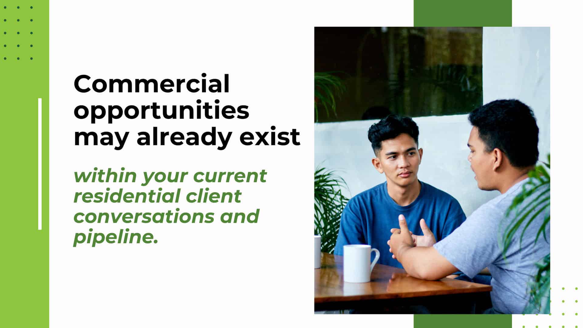 That means starting with how you listen, not how you market. It means recognizing commercial needs when they appear naturally in residential conversations, rather than forcing the conversation prematurely. And it means building just enough internal process to handle those opportunities cleanly, without over-engineering before deal flow exists.